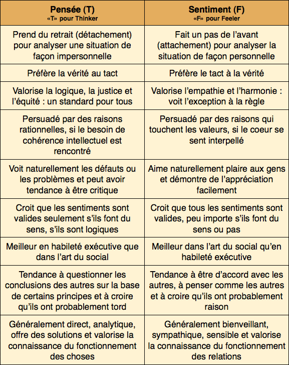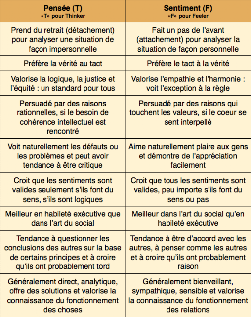 Voici maintenant un tableau comparatif que j’ai fait à partir de mes lectures sur le MBTI. Ce tableau donne en exemple quelques effets que peuvent avoir chacune de ces deux fonctions cognitives liées au jugement. C’est seulement pour cette préférence que les sondages révèlent une différence de la préférence en lien avec le genre. 75% des hommes préféreraient la pensée et 25% le sentiment. L’inverse est le cas pour les femmes : 75% préfèrent décider en se basant sur leurs valeurs et leurs sentiments tandis que 25% préfèrent utiliser les raisonnements d’ordre impersonnel et objectif.