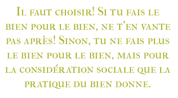 Il est possible que les athées (tout comme les croyants) fassent le bien non pour le bien, mais pour la satisfaction que la pratique du bien leur apporte personnellement. Appelons cette satisfaction personnelle des récompenses intérieures : conscience tranquille, paix, joie, fierté, réalisation personnelle, sentiment d’utilité, d’être généreux, etc. En fait, une personne peut faire une panoplie de bonnes choses, mais avoir une attitude fondamentalement orgueilleuse et condescendante ce qui vient jeter un ombrage sur sa pratique du bien en général. C’est ce que Jésus évoquait par cette illustration du pharisien condescendant : « Le pharisien, debout, priait ainsi en lui-même : ‘O Dieu, je te rends grâces de ce que je ne suis pas comme le reste des hommes qui sont ravisseurs, injustes, adultères, ou même comme ce publicain… je jeûne deux fois la semaine, je donne la dîme de tous mes revenus.’ » (Luc 18:11-12)
