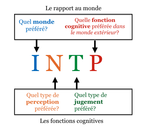 Conclusion : Donc dans sa hiérarchie des fonctions, l’intuition extravertie (Ne) du INTP viendra en deuxième et, par déduction, si le monde intérieur est son monde préféré et qu’il utilise la perception intuitive dans son monde extérieur, cela veut dire qu’il utilise la pensée (T) comme jugement dans le monde intérieur (Ti)3La perception et le jugement étant les deux seules fonctions cognitives selon cet indicateur. Je trouve intéressant que ces deux fonctions cognitives soient en quelque sorte similaires aux notions, en programmation, “d’entrées” et de “sorties”..