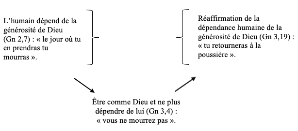 En Gn 2-3, après que la vie ait été présentée comme un don Dieu (Gn 2,7) qui s’inscrit dans la continuité (Gn 2,17), la précarité de l’être humain est niée (Gn 3,4), puis réafirmée par Dieu (Gn 3,19). Walter Brueggemann propose ce modèle17Walter Brueggemann, Remember You Are Dust, p. 80. :